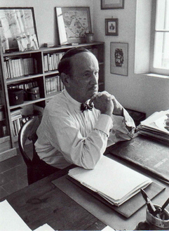 par Gisèle Freund (à gauche : photo de Gisèle Freund - le poète, posant avec l'autorité tranquille du maître d'œuvre de son "édition de la Pléiade", du nom même du dossier qu'il tient sous le coude), l'intégralité de cette séquence filmée en est à la fois un complément, mais aussi une limite en quelque façon. Tout se passe, dans le corpus photographique relatif à la biographie de Perse, en tout cas de sa période publique au sens large du terme (on pourrait observer le phénomène à partir des photographies de la période de jeunesse), comme si cette volonté d'auto-contrôle était omniprésente. Pour tout observateur attentif - et surtout, informé de cette tension constante vers la maîtrise de l'image, de la représentation du Poète, qu'a mis en lumière toute une part de la critique -, ce versant iconographique, cette illustration photographique de l'icône justement, ne fait pas de doute. On pourrait, là-dessus, établir toute une étude, et la chose a d'ailleurs été faite en partie (voir l'étude de Renée Ventresque à propos des illustrations du volume Honneur à Saint-John Perse qui fut largement contrôlé par le poète lui-même). Le phénomène de cette constante volonté de contrôle culmine évidemment à partir de 1960, année du Nobel mais aussi, année où débute le long processus de préparation des Œuvres complètes. Au prix d'une rigidité, d'une raideur tout à fait visibles, Saint-John Perse apparaît sur les clichés de cette époque (surtout sur les superbes photos de Lucien Clergue prises aux Vigneaux) dans l'attitide hiératique du "Poeta laureatus", du Poète de gloire dont l'image même aura eu pour effet d'éloigner tout un lectorat, mais qui est en tout cas conforme au personnage construit qui est lui-même "œuvre œuvrée" qui habite la Pléiade de 1972. Tout cela concorde, en effet, avec toutes les mises en perspectives établies depuis lors. Certes. Mais là où la séquence filmée dont il est question ici complètent l'iconographie, relevant ô combien de la même geste, une limite donc semble être atteinte, et apparaîtra aussi à tout regard scrupuleux.